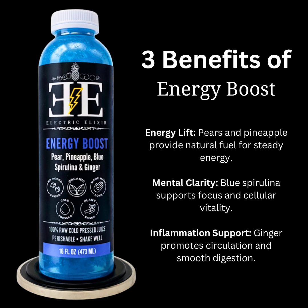 Recharge with Energy Boost, a refreshing blend of pear, pineapple, ginger, and blue spirulina. This vibrant blue elixir is lightly sweet, tropical, and invigorating, designed to deliver clean energy and clear focus when your body needs it most.